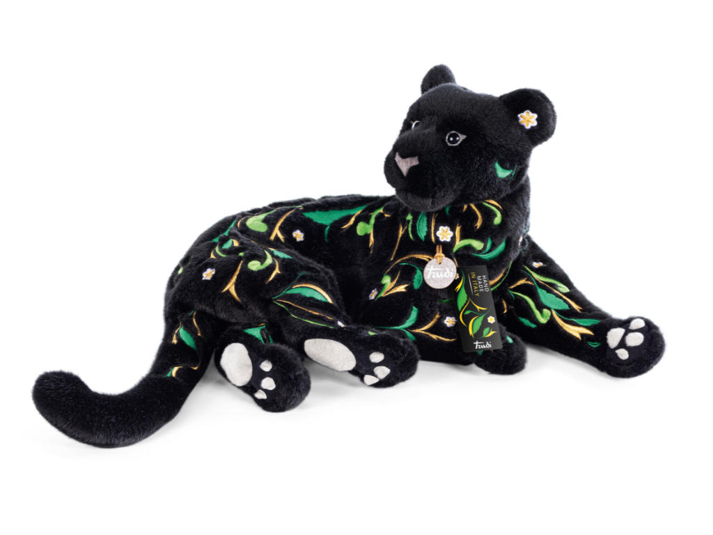 Il folto e luminoso manto nero dell’iconica pantera Iris diventa una tela nella quale fogliame, petali e fiori si inseriscono tra fili dorati e punti di colore, in una perfetta crasi tra ricamo e pelliccia.